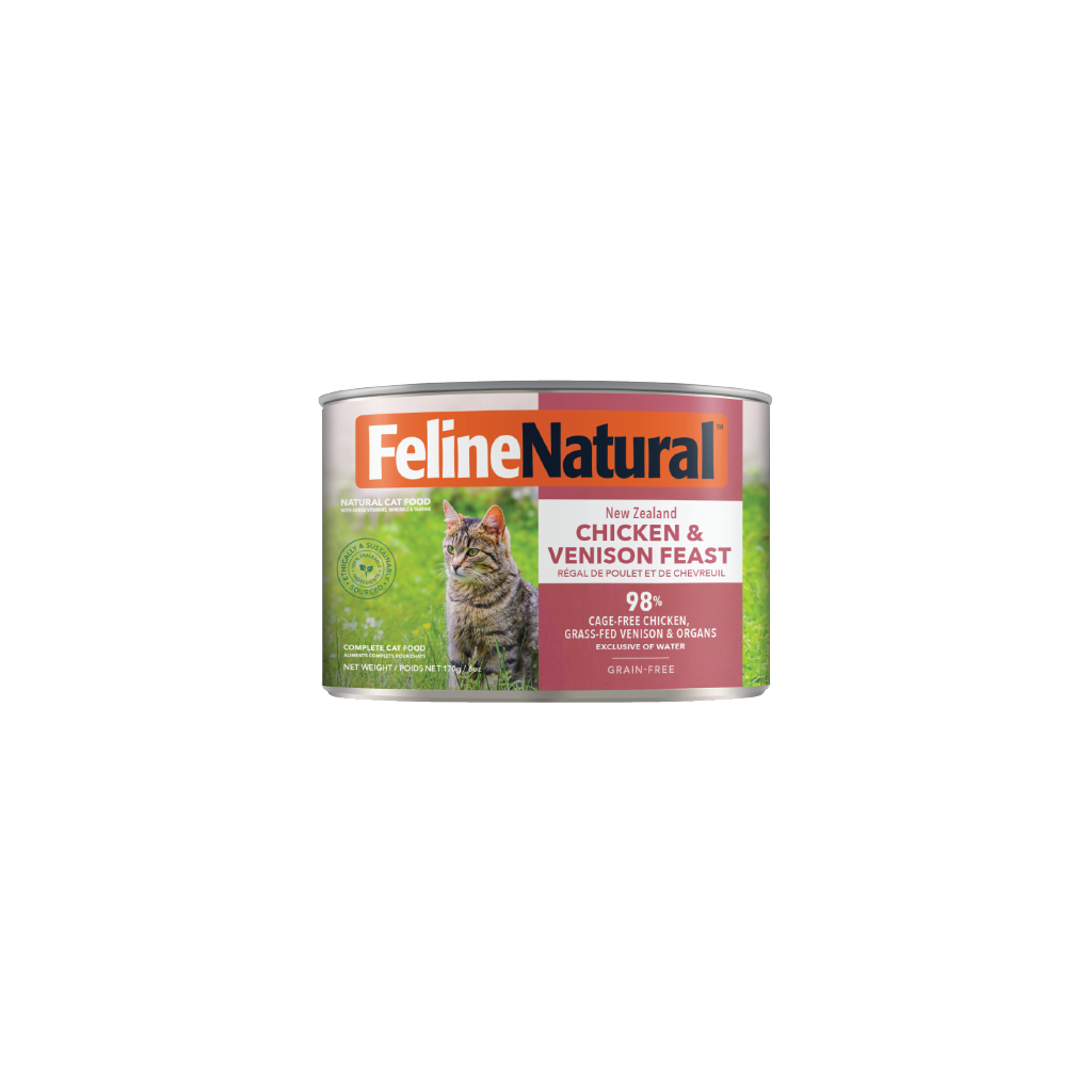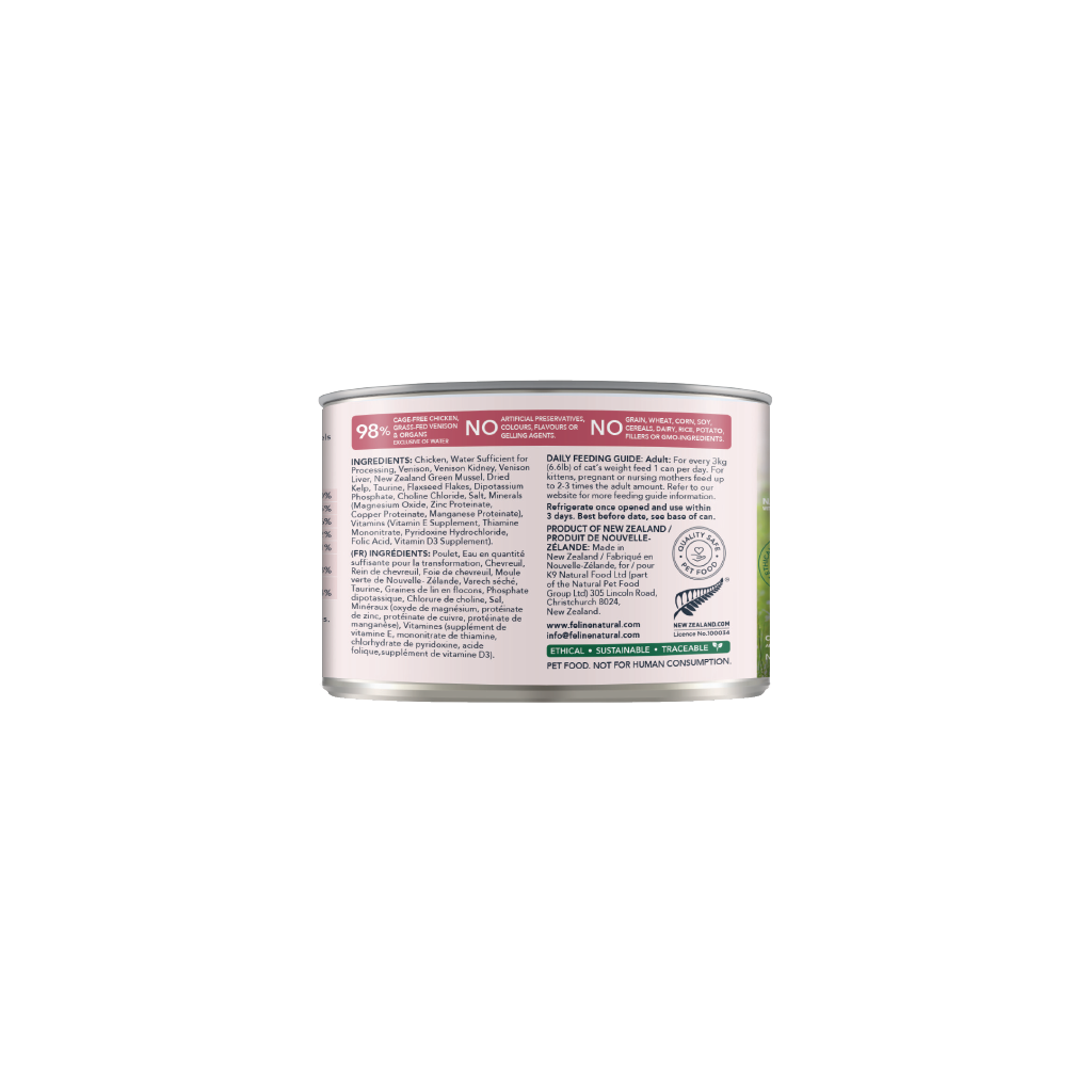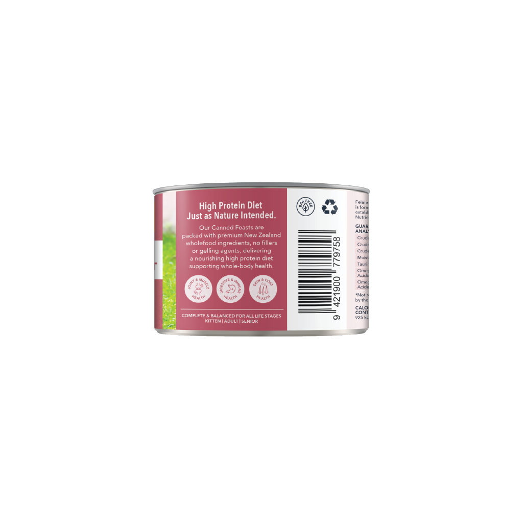 Our complete and balanced New Zealand Lamb & Venison Feast Cans contain 98% Grass-fed & Grass-finished Lamb, Venison & Organs, with New Zealand Green Mussels, Flaxseed Flakes, Oils, Kelp, Vitamins, Minerals and Taurine in support of your cat's whole-body health.