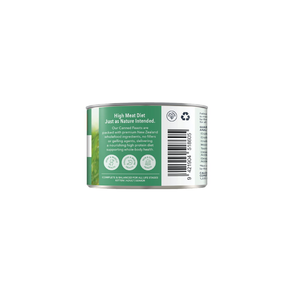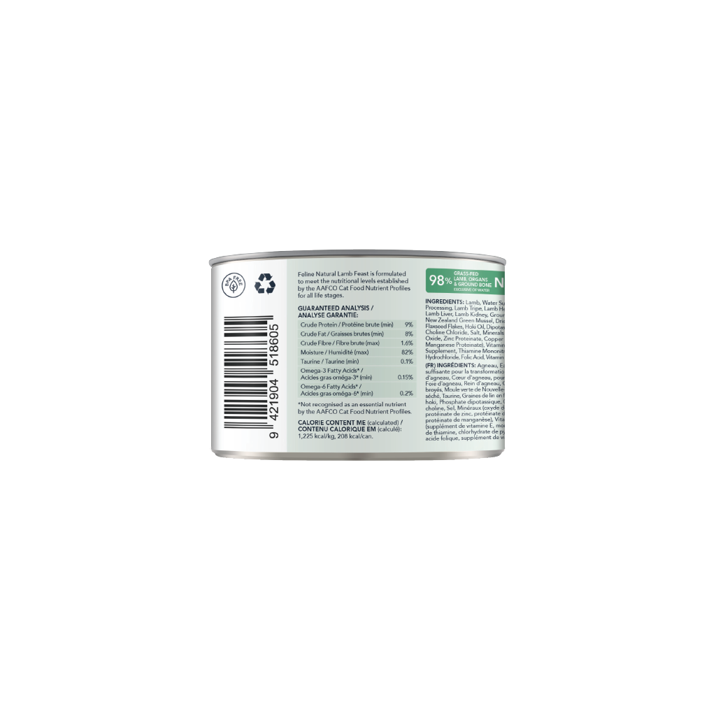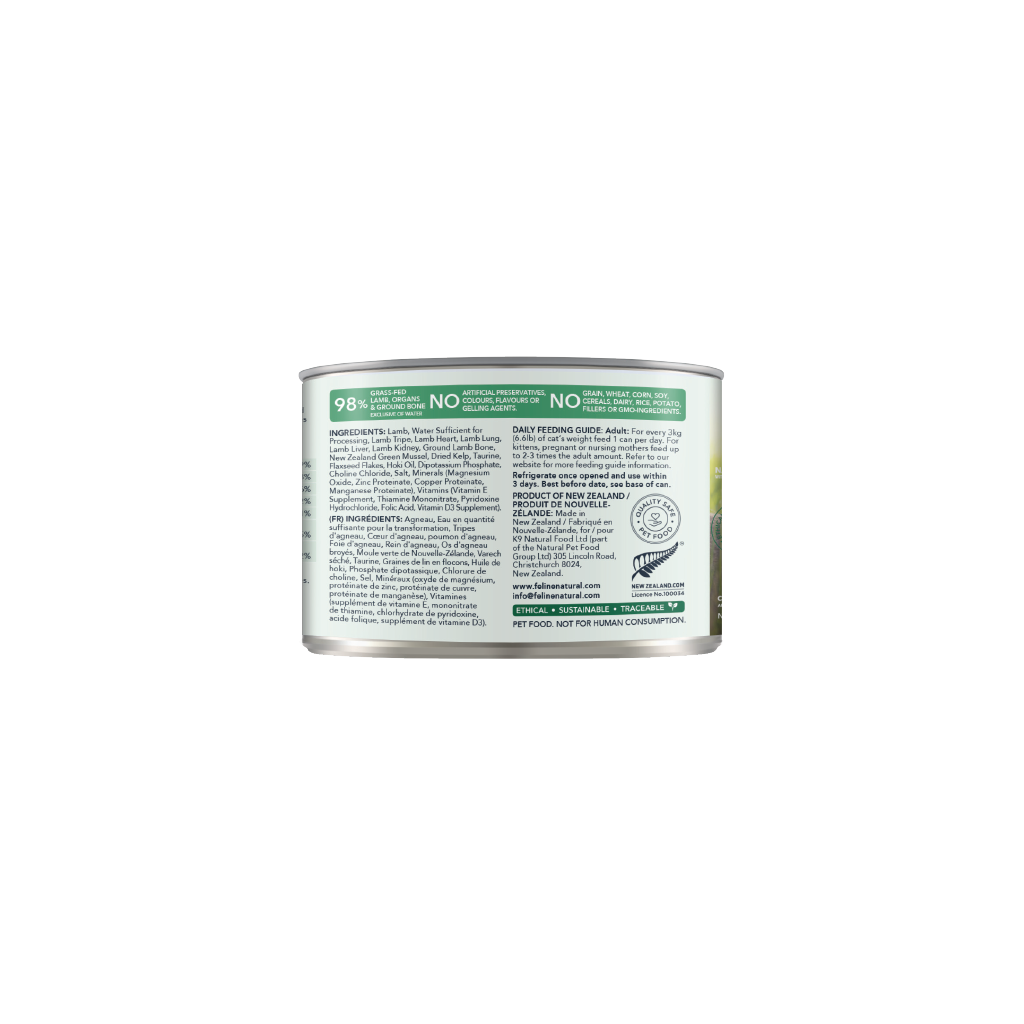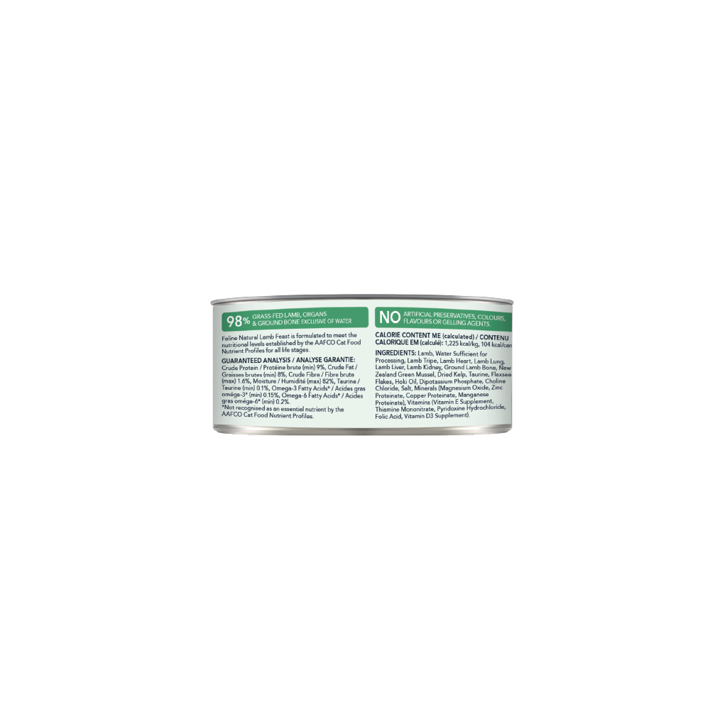 Our complete and balanced New Zealand Lamb Feast Cans contain 98% Grass-fed & Grass-finished Lamb & Organs and Ground Bone, with New Zealand Green Mussels, Flaxseed Flakes, Oils, Kelp, Vitamins, Minerals and Taurine in support of your cat's whole-body health.