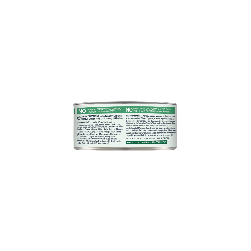 Lamb, Water Sufficient for Processing, Lamb Tripe, Lamb Heart, Lamb Lung, Lamb Liver, Lamb Kidney, Ground Lamb Bone, New Zealand Green Mussel, Dried Kelp, Taurine, Flaxseed Flakes, Hoki Oil, Dipotassium Phosphate, Choline Chloride, Salt, Minerals (Magnesium Oxide, Zinc Proteinate, Copper Proteinate, Manganese Proteinate), Vitamins (Vitamin E Supplement, Thiamine Mononitrate, Pyridoxine Hydrochloride, Folic Acid, Vitamin D3 Supplement).